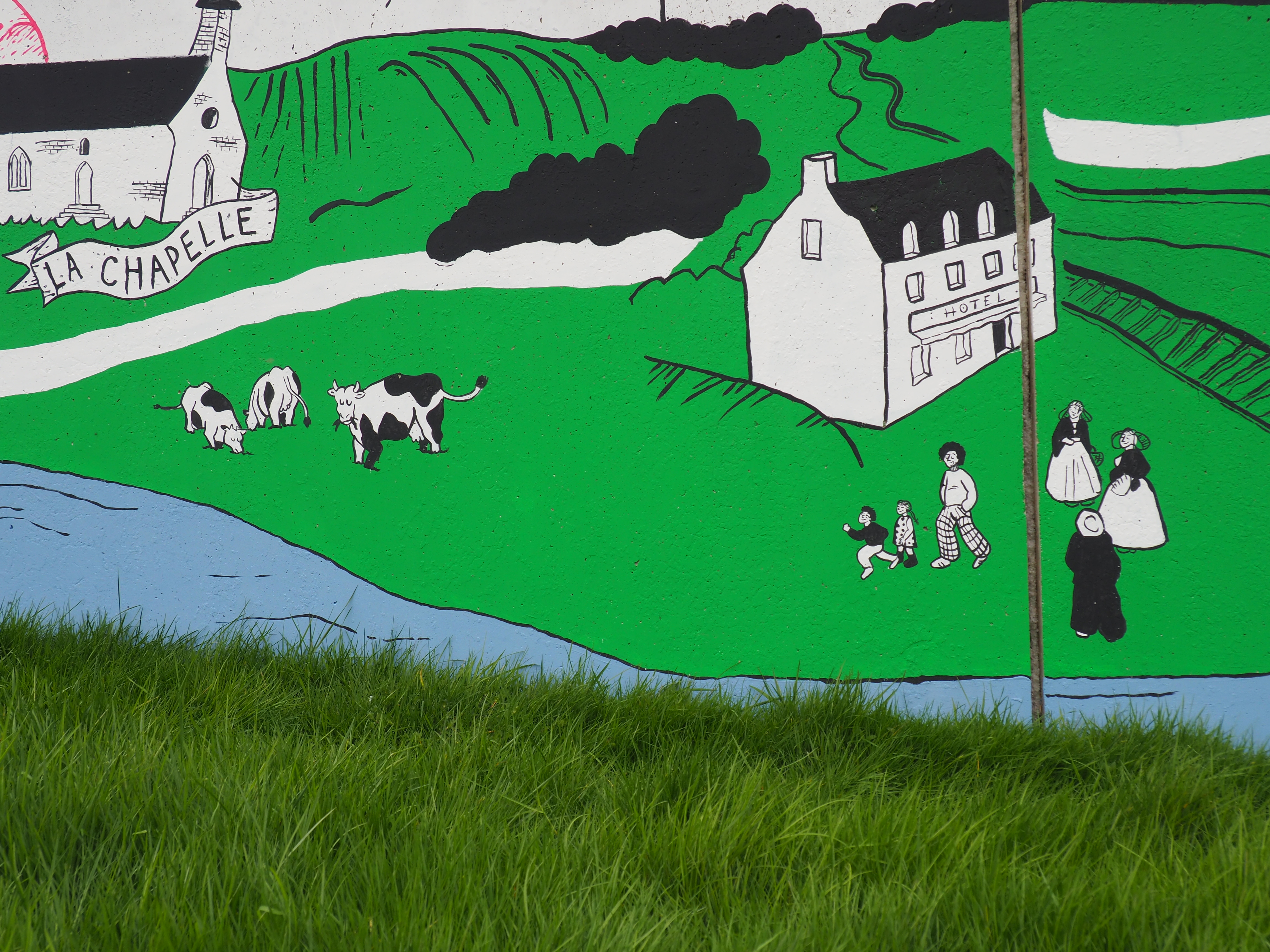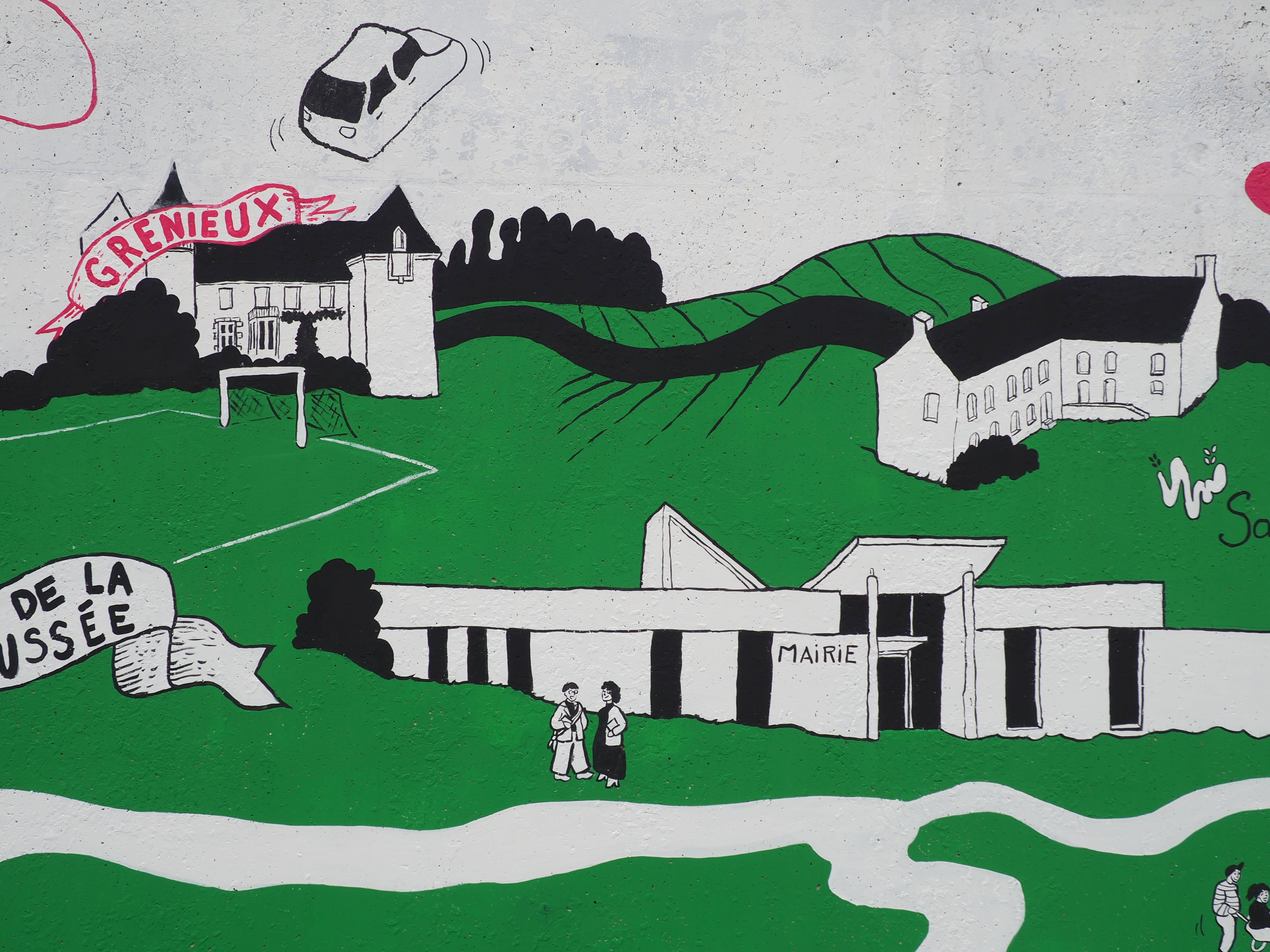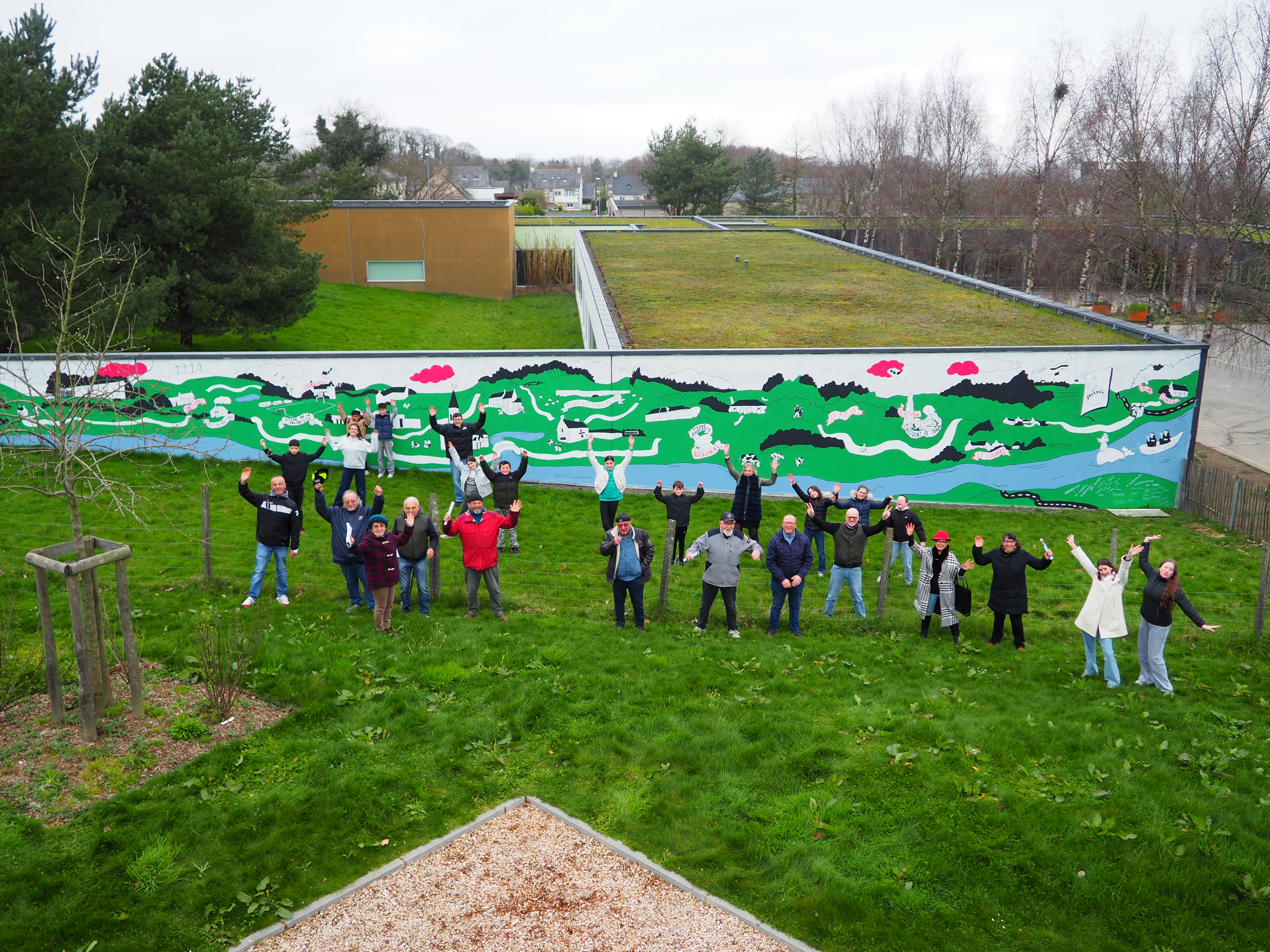 Cette collaboration aboutit à la réalisation d’une fresque monumentale, conçue à partir des récits, des observations et des projections recueillies. Située sur le mur de l’école primaire « Les Chrysalides », la fresque raconte l’histoire passée et présente de la commune tout en ouvrant des perspectives sur son avenir, imaginé collectivement par les enfants et les sages.