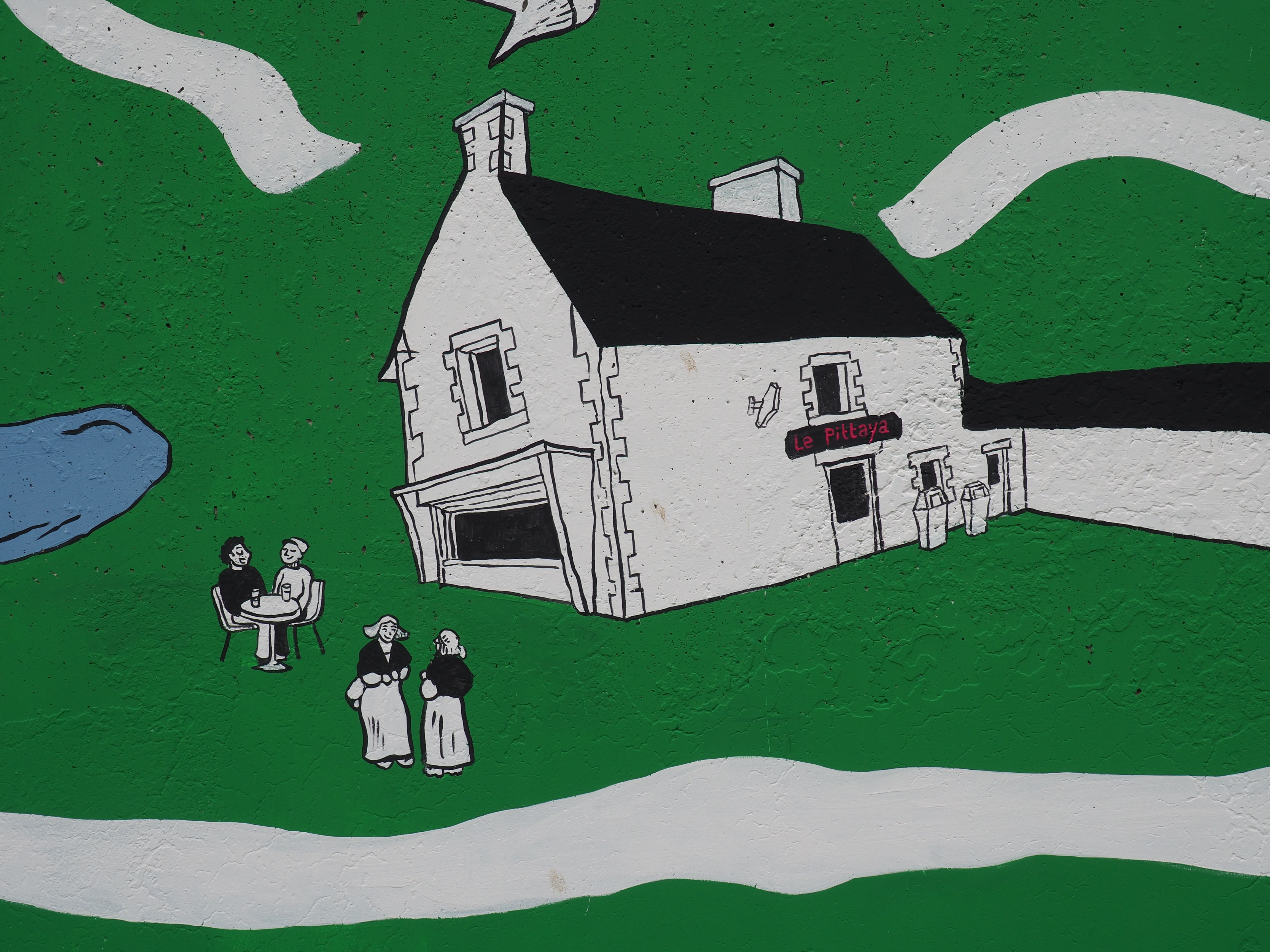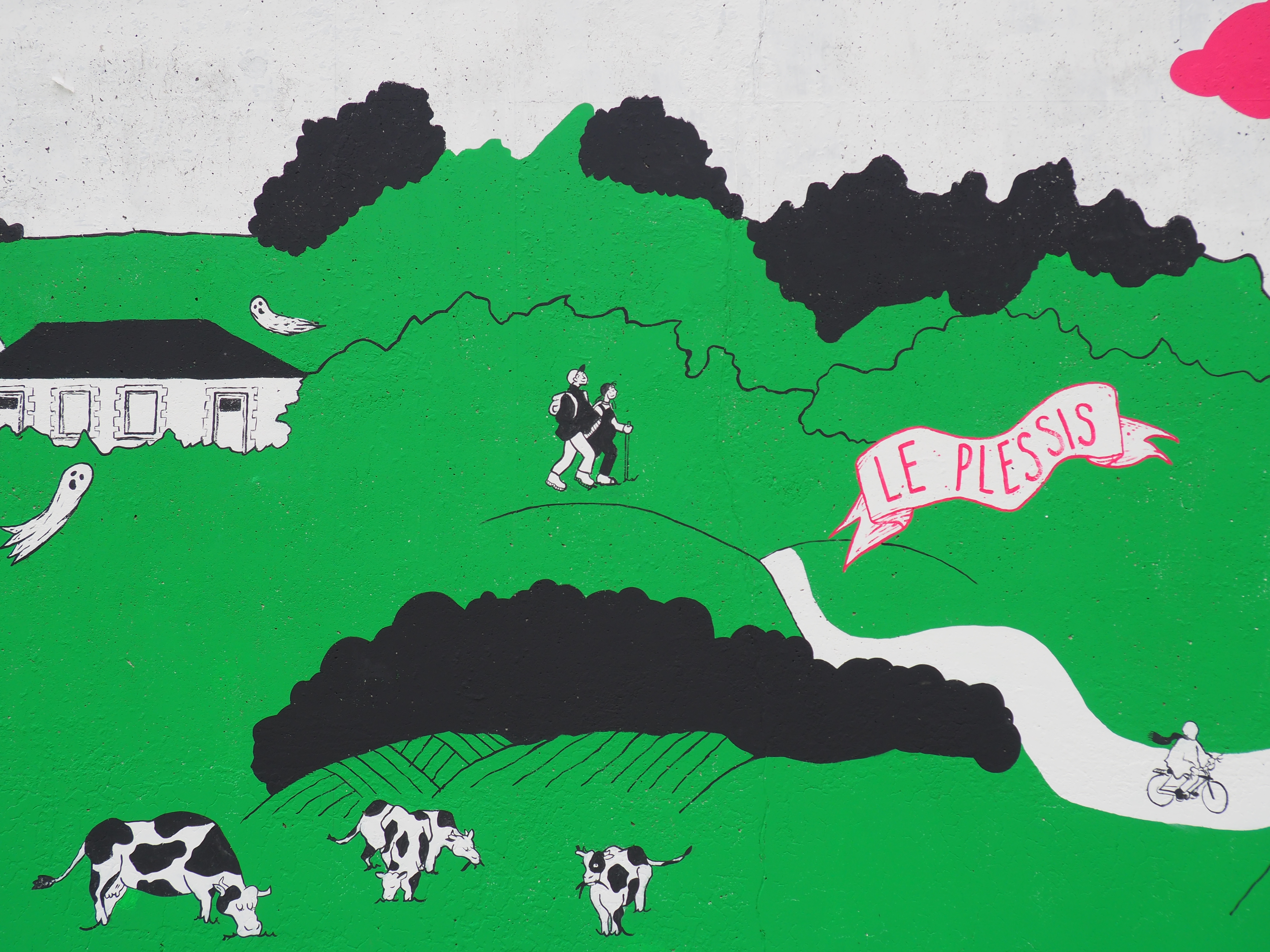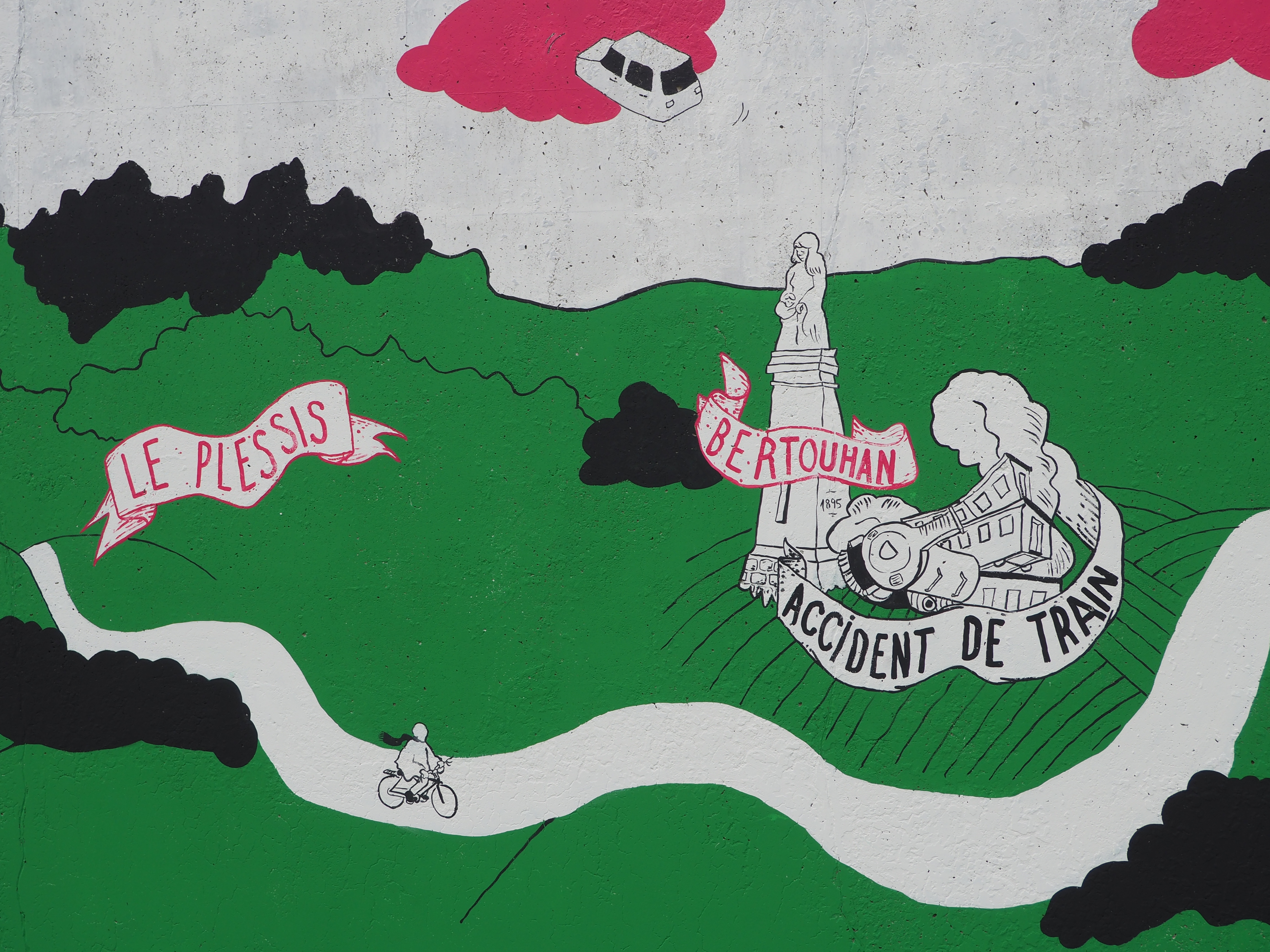 Cette collaboration aboutit à la réalisation d’une fresque monumentale, conçue à partir des récits, des observations et des projections recueillies. Située sur le mur de l’école primaire « Les Chrysalides », la fresque raconte l’histoire passée et présente de la commune tout en ouvrant des perspectives sur son avenir, imaginé collectivement par les enfants et les sages.